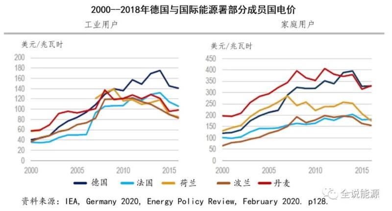 我們知道的是,為了推進(jìn)能源轉(zhuǎn)型,德國(guó)花費(fèi)了巨額的財(cái)政支出,其中自2000年以來(lái),德國(guó)在能源轉(zhuǎn)型過(guò)程中的稅收減免和可再生能源補(bǔ)貼總支出就超過(guò)了2430億歐元。羊毛當(dāng)然是出在羊身上,這些巨額的財(cái)政支出最終都轉(zhuǎn)嫁給了德國(guó)的普通百姓。因?yàn)檎鞫?、收費(fèi)和稅收,包括用于支付可再生能源補(bǔ)貼的稅收,德國(guó)消費(fèi)者支付的電價(jià)在國(guó)際能源署成員國(guó)中是最高的。2018年,盡管能源密集型行業(yè)的價(jià)格大幅下降,但德國(guó)在國(guó)際能源署成員國(guó)中工業(yè)電價(jià)排名第三,其中稅收占整個(gè)工業(yè)電價(jià)的48%,是國(guó)際能源署成員國(guó)中最高的;家庭用戶(hù)支付的總電價(jià)中,大約一半是公共費(fèi)用,僅次于丹麥,排名第二。