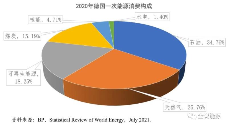 具體細(xì)分,德國(guó)的能源消費(fèi)高度依賴(lài)傳統(tǒng)的化石能源。2020年,德國(guó)一次能源消費(fèi)結(jié)構(gòu)中,石油是第一大能源來(lái)源,占比34.76%;天然氣第二,占比25.76%;可再生能源第三,占比18.25%;煤炭第四,占比15.19%;核能第五,占比4.71%;水電第六,占比1.4%。