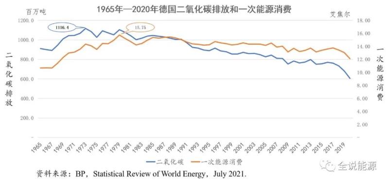 從1973年至1990年的18年里,除1979年為11.042億噸外,德國(guó)能源消費(fèi)產(chǎn)生的二氧化碳排放保持在10億噸略多一點(diǎn)。從1991年開(kāi)始,德國(guó)能源消費(fèi)產(chǎn)生的二氧化碳排放跌破10億噸,1997年跌破9億噸,2009年跌破8億噸,2019年跌破7億噸,2020年為6.048億噸,是1965年有統(tǒng)計(jì)數(shù)字以來(lái)的最低水平。