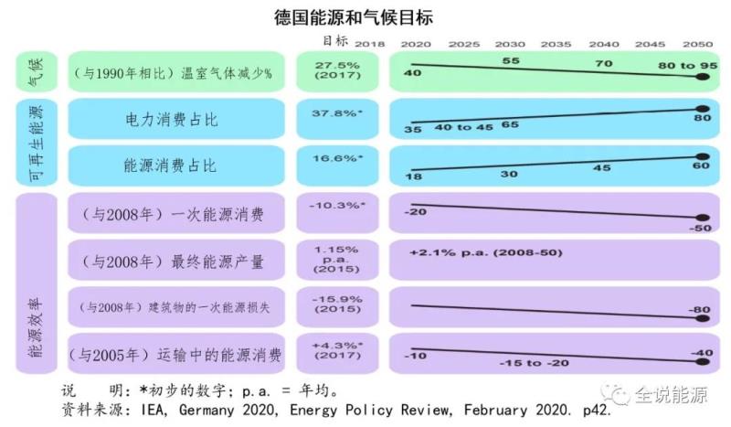 綜合上述有關(guān)文件,為了實(shí)現(xiàn)能源轉(zhuǎn)型,德國(guó)政府計(jì)劃,以2008年為基準(zhǔn),2020年德國(guó)一次能源消費(fèi)要下降20%,2050年要下降50%;以1990年為基準(zhǔn),2020年德國(guó)溫室氣體排放要下降40%,2030年要下降55%,2050年要下降80-95%;來(lái)源于可再生能源的發(fā)電,2020年至少要達(dá)到35%,2030年要達(dá)到50%,2040年要達(dá)到65%,2050年要達(dá)到80%。