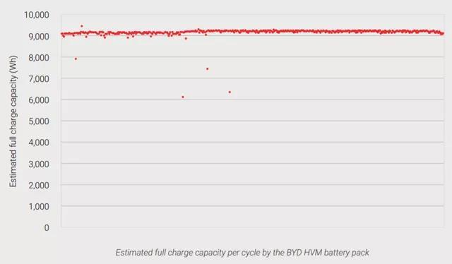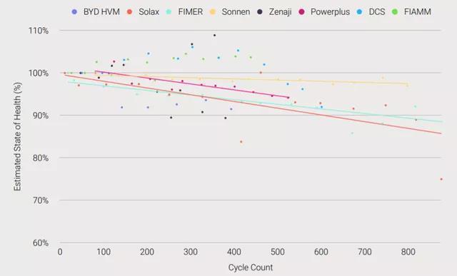 sonnenBatterie的測試情況是800次循環(huán)基本看不出來明顯的衰減。很有趣的是,比亞迪的儲能電池400次循環(huán)下也沒有明顯的衰減。