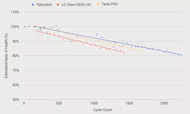 在第二階段測試中,上海派能能源科技(PYLONTECH)的US2000B 是表現(xiàn)最好的,大概在2300個循環(huán)到80%,按照估算在4,470次循環(huán)中到60% 的容量。