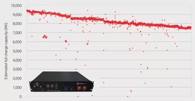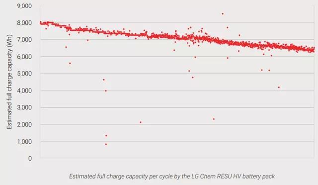 Tesla Powerwall 2 測試大概在1700個循環(huán),容量衰減在83%左右,根據(jù)估算SOH和循環(huán)之間的線性回歸,Tesla Powerwall 2大概在3,680 次循環(huán)以后容量變?yōu)?0%(當(dāng)然后期的衰減速度可能會加速,不能這么外推)。