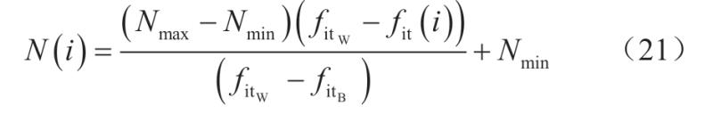 式中:N(i)為個(gè)體i產(chǎn)生的后代數(shù);Nmax和Nmin分別為每個(gè)個(gè)體可產(chǎn)生最大和最小的后代數(shù);fitW和fitB分別為當(dāng)前種群中個(gè)體最差和最好的適應(yīng)度;fit(i)為個(gè)體i的適應(yīng)度函數(shù)。