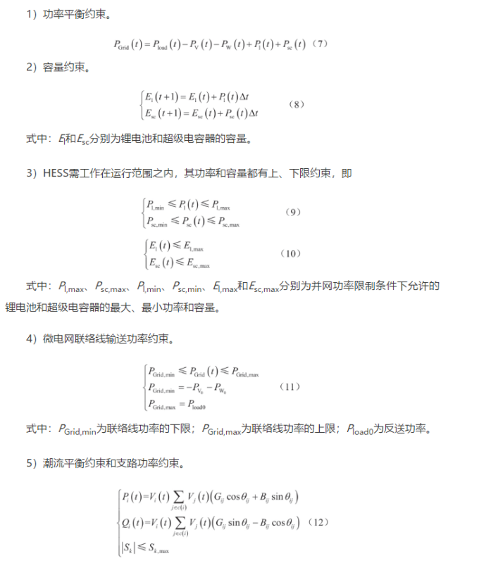 超級(jí)電容器、鋰電池和聯(lián)絡(luò)線要滿足并網(wǎng)型微電網(wǎng)平衡方程和各自約束[21-22]。