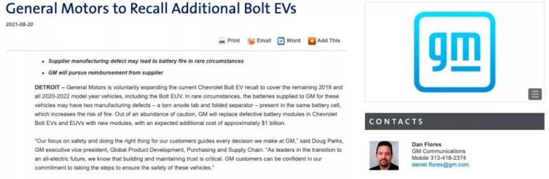 僅僅一個(gè)月后,也就是在今年的8月份,通用又?jǐn)U大了召回范圍,新增召回7.3萬(wàn)輛車,幾乎將售出的Bolt EV車型都進(jìn)行了召回。