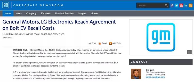 就在昨晚,通用汽車在官網(wǎng)發(fā)布消息表示已經(jīng)與LG化學(xué)的母公司LG就Bolt EV的召回成本問(wèn)題達(dá)成了協(xié)議,LG同意最高將會(huì)向通用汽車賠償19億美元(約合人民幣122.5億元)。