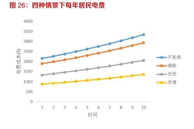 根據(jù)計(jì)算結(jié)果,十年里,四種情景下光儲(chǔ)系統(tǒng)的每年電費(fèi)比不安裝光伏和儲(chǔ)能系統(tǒng)低 59%;安裝 光伏比不安裝低 38%;由于美國(guó)居民用電量高,且峰谷價(jià)差大,安裝儲(chǔ)能的年用電費(fèi)也比不安裝 低 12%。綜合設(shè)備成本、設(shè)備維護(hù)費(fèi)用及電費(fèi)來(lái)看,相比于不安裝的情景,在全壽命周期內(nèi),安裝 光儲(chǔ)及單獨(dú)安裝光伏都具備一定的經(jīng)濟(jì)性,單獨(dú)安裝光伏的累計(jì)成本為$23918.93,安裝光儲(chǔ)系統(tǒng) 的累計(jì)成本為$22422.01。使用時(shí)間超過(guò) 8 年,安裝光儲(chǔ)系統(tǒng)相比于其他方案跟節(jié)約成本。