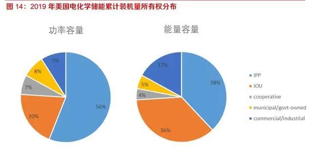 美國(guó)儲(chǔ)能應(yīng)用場(chǎng)景包括表前(Front of the Meter,F(xiàn)TM)和表后(Behind the Meter,BTM), 對(duì)應(yīng)于國(guó)內(nèi)應(yīng)用場(chǎng)景的劃分,表前通常指電網(wǎng)側(cè)和發(fā)電側(cè),表后指用戶側(cè),包括家庭和工商業(yè)。目 前美國(guó)表前側(cè)儲(chǔ)能市場(chǎng)分屬于不同的區(qū)域電力市場(chǎng),目前較大的為PJM市場(chǎng)、CAISO市場(chǎng)、ERCOT 市場(chǎng)等,儲(chǔ)能的市場(chǎng)供給參與方包括 IPP(獨(dú)立發(fā)電商)、IOU(投資者擁有的公用事業(yè)端)等。根據(jù) EIA 統(tǒng)計(jì),截至 2019 年,IPP 擁有美國(guó)大型電化學(xué)儲(chǔ)能現(xiàn)有功率容量的 56%,IOU 擁有 20%, 而針對(duì)能量市場(chǎng),IPP 擁有 38%,IOU 擁有 36%。