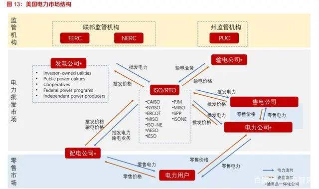 美國(guó)電力體系的市場(chǎng)化成熟,形成了由聯(lián)邦層面的 FERC(美國(guó)聯(lián)邦能源監(jiān)管委員會(huì))和 NERC (北美可靠電力公司)以及州層面的 PUC(公用事業(yè)委員會(huì))監(jiān)管的市場(chǎng)體系。美國(guó)的電力系統(tǒng)被劃分為東部網(wǎng)(Eastern Interconnection)、西部網(wǎng)(Western Interconnection)和德 州網(wǎng)(Electric Reliability Council of Texas, ERCOT)三大區(qū)域電網(wǎng)。在電網(wǎng)內(nèi)劃分為多個(gè)區(qū) 域市場(chǎng)。市場(chǎng)主體是 RTO(區(qū)域傳輸組織)或 ISO(獨(dú)立系統(tǒng)運(yùn)營(yíng)方)。