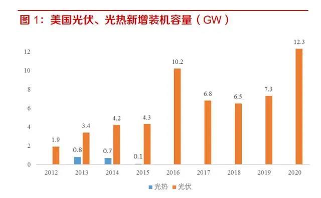 美國(guó)可再生能源裝機(jī)容量大幅提升。為達(dá)成碳中和目標(biāo),美國(guó)加速推進(jìn)電氣化計(jì)劃,推動(dòng)可再生能 源成為發(fā)電主力。根據(jù) EIA 統(tǒng)計(jì),2020 年,美國(guó)新增光伏裝機(jī) 12.3GW,在疫情影響下仍達(dá)到了 歷史最大容量增幅;新增風(fēng)電裝機(jī) 17.1GW,可再生能源(包括風(fēng)能、水電、太陽(yáng)能、生物質(zhì)能和 地?zé)崮埽┊a(chǎn)生了創(chuàng)紀(jì)錄的 8340 億 kWh 的電力,約占美國(guó)總發(fā)電量的 21%。可再生能源有史以 來(lái)首次超過(guò)核能(7900 億 kWh)和煤炭(7740 億 kWh)。