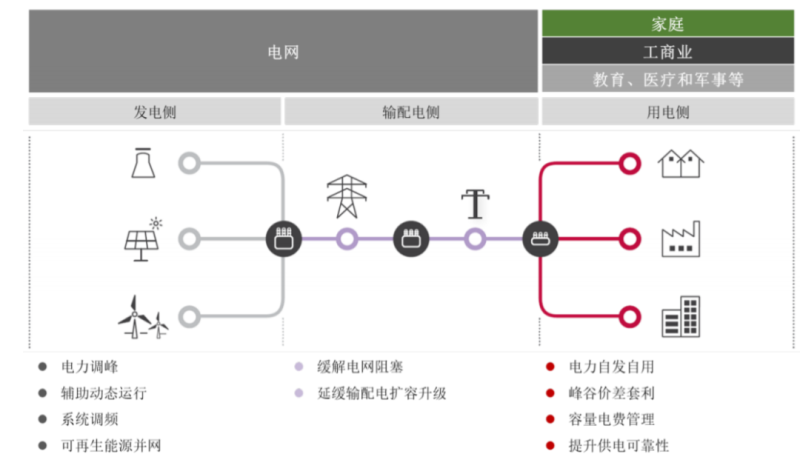 基于多變的應(yīng)用途徑,實際上電化學(xué)儲能已經(jīng)突破了單純的存儲功能,而是應(yīng)用于整個用電體系的各個環(huán)節(jié)。