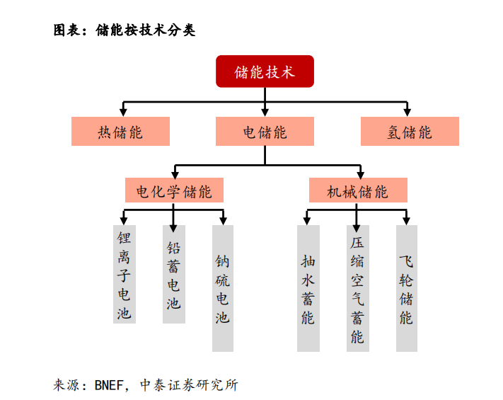 按照儲能方式的不同,儲能可以劃分為熱儲能、電儲能和氫儲能三大類。其中,電儲能最為成熟,抽水蓄能、壓縮空氣儲能、電化學(xué)儲能、飛輪蓄能等均屬于電儲能。