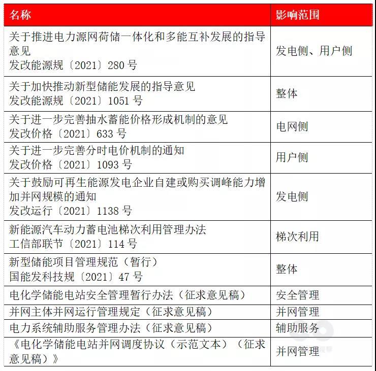 在此之前,涉及儲(chǔ)能整體發(fā)展規(guī)劃、項(xiàng)目管理、價(jià)格機(jī)制等多個(gè)文件都在2021年出臺(tái)。據(jù)eo了解,還有若干與儲(chǔ)能直接相關(guān)的政策文件目前正在制定之中。