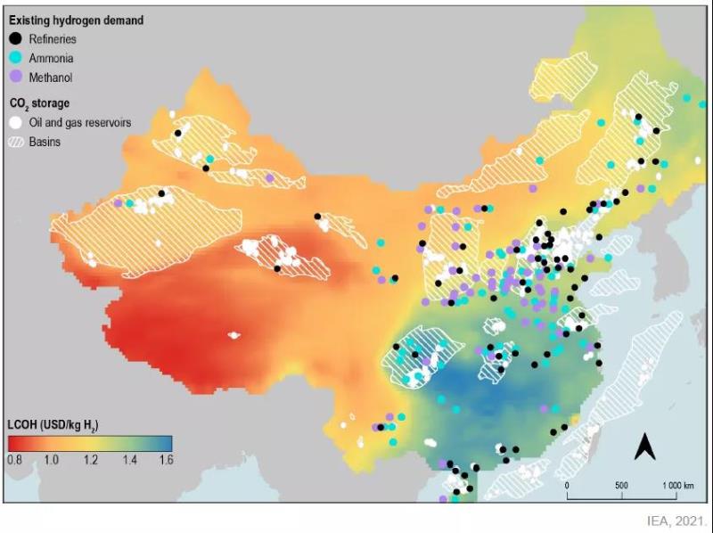 ? 圖10 中國現(xiàn)有氫能需求、可再生制氫的成本與潛在的二氧化碳封存地點