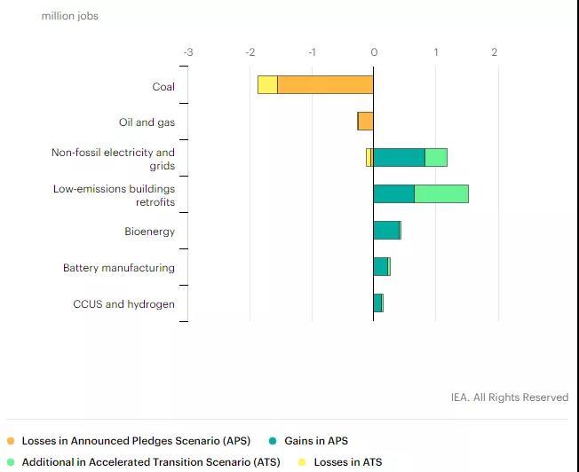 在2030年之前加快進程所帶來的社會經(jīng)濟效益不僅限于應對氣候變化。這些益處包括為尚未充分受益于中國經(jīng)濟發(fā)展的地區(qū)帶來更大的繁榮,中國在全球清潔能源技術價值鏈中發(fā)揮核心作用,并逐漸成為清潔能源創(chuàng)新的領袖。到2030年,加快國內(nèi)行動將使中國清潔能源供應領域的就業(yè)人數(shù)增加360萬,而在化石燃料供應和化石燃料電廠減少的就業(yè)崗位為230萬。在加速轉型情景(ATS)中,凈增長就業(yè)崗位比承諾目標情景多出近100萬。如果其他國家志向更高遠,對清潔能源技術需求更多,而中國能抓住這種機會,還會增加更多就業(yè)崗位。