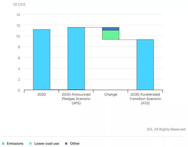 盡早加大力度采取行動可以減少2030年后面臨的減排負擔。碳達峰的時機和水平,以及達峰后的減排速度,對于中國實現(xiàn)碳中和的長期目標至關重要。中國擁有的技術能力、經(jīng)濟手段和政策經(jīng)驗,可以比承諾目標情景(APS)更快地完成2030年的清潔能源轉型目標。中國最近推出的碳排放交易市場和電力市場改革就是兩個明顯的例子。在加速轉型情景(ATS)中,政策進程加快,帶來電力和工業(yè)中的煤炭用量更快下降,現(xiàn)有的低碳技術得到更有力的部署,和更快的能效提升。到2030年,在加速轉型情景(ATS)中,能源體系的二氧化碳排放量比現(xiàn)有水平低了20多億噸,減少了近20%。投資需求不是一個主要障礙:加速轉型情景(ATS)所需的累計投資與承諾目標情景(APS)所需的相似。