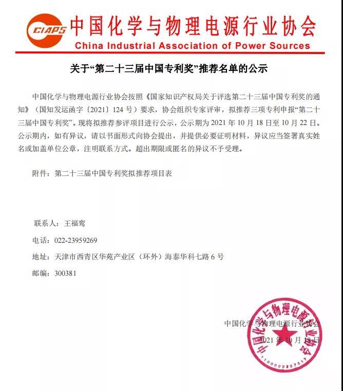 中國化學(xué)與物理電源行業(yè)協(xié)會按照《國家知識產(chǎn)權(quán)局關(guān)于評選第二十三屆中國專利獎的通知》(國知發(fā)運(yùn)函字〔2021〕124號)要求,協(xié)會組織專家評審,擬推薦三項(xiàng)專利申報“第二十三屆中國專利獎”?,F(xiàn)將擬推薦參評項(xiàng)目進(jìn)行公示,公示期為2021年10月18日至10月22日。公示期內(nèi),如有異議,請以書面形式向協(xié)會提出,并提供必要證明材料,異議應(yīng)當(dāng)簽署真實(shí)姓名或加蓋單位公章,注明聯(lián)系方式。超出期限或匿名的異議不予受理。