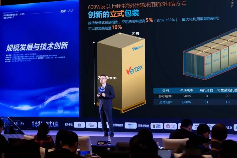 天合光能全球市場(chǎng)與產(chǎn)品負(fù)責(zé)人張映斌博士介紹稱,海外以集裝箱運(yùn)輸為主,受集裝箱2.58米的門高所限,行業(yè)有聲音認(rèn)為組件寬度將被限制在1.135米以內(nèi),不可逾越。但事實(shí)上,天合光能不僅打破了尺寸桎梏,技術(shù)工程團(tuán)隊(duì)經(jīng)過廣泛調(diào)研、深度研究,更一舉打破包裝傳統(tǒng),創(chuàng)新開發(fā)了立式包裝解決方案:和傳統(tǒng)橫式包裝相比,可以增加裝載量10%,集裝箱空間利用率提高5%,最大化利用集裝箱空間。在海運(yùn)費(fèi)用節(jié)節(jié)攀升的大背景下,假如從中國(guó)到歐洲,以現(xiàn)在主流價(jià)格1萬美元每箱的運(yùn)費(fèi)為例,換算成人民幣,創(chuàng)新包裝可節(jié)約運(yùn)費(fèi)2分錢每瓦!