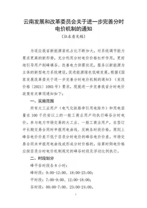 云南省發(fā)展和改革委員會向社會公開征求《關于進一步完善分時電價機制的通知(征求意見稿)》意見的公告