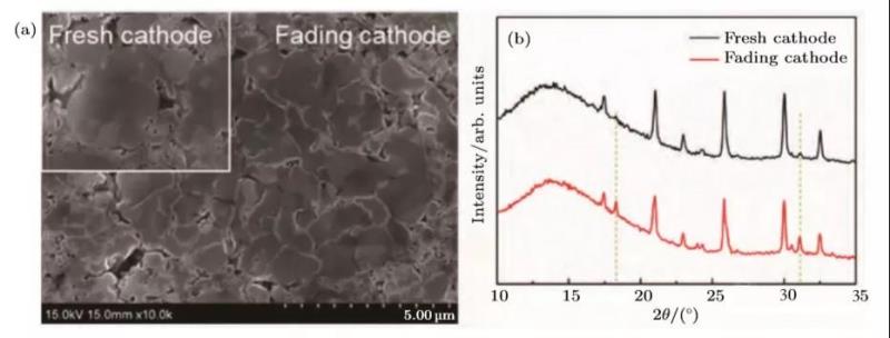 所謂電池有損檢測是指通過電池拆解、極片觀察及材料測試分析來確定正負極片、活性材料以及隔膜等因素在電池失效中的作用。其中材料的測試分析則以物化性能和電化學(xué)性能測試為主。例如對上述LiFePO4/C失效電池極片進行掃描電子顯微鏡(SEM)形貌測試結(jié)果顯示正極材料有明顯的結(jié)構(gòu)破壞,X射線衍射(XRD)結(jié)構(gòu)譜圖中18.5?和31?峰強的增加揭示了Fex(POy)相的增加,即正極材料存在相變現(xiàn)象(如圖8所示)。對極片表面進行X射線光電子能譜(XPS)分析,以及對極片進行半電池測試則能夠定性和定量分析極片表面SEI和容量損失。最后總結(jié)得出定性或定量的失效原因,并提供分析報告。鋰電池失效機理研究是通過大量基礎(chǔ)科研,以及構(gòu)建合理模型和驗證實驗, 準確模擬分析電池內(nèi)部復(fù)雜的物理化學(xué)反應(yīng)過程, 找出電池失效的本質(zhì)原因,構(gòu)建失效原因數(shù)據(jù)庫。電池機理分析可能會從不同角度去開展,包括設(shè)計材料角度和設(shè)計失效角度。