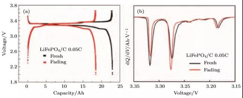 圖7 某款LiFePO4/C失效電池和新鮮電池全電池(a)充放電曲線及(b)對應(yīng)放電曲線的IC曲線