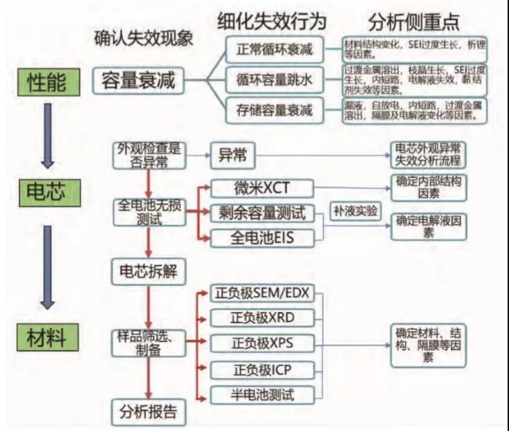 電池企業(yè)及材料企業(yè)各自開展鋰離子電池失效分析的研究,但多偏重于電池制造工藝和材料的研發(fā)制備,以提高電池性能、降低電池成本為直接目標,多采用大量正向驗證實驗,并累積了豐富的經(jīng)驗和方法,但在逆向解析和精準分析方面存在經(jīng)驗和技術(shù)仍有欠缺的問題。出于效率和效益的角度考慮,相關(guān)企業(yè)更希望在現(xiàn)有常規(guī)測試技術(shù)的基礎(chǔ)上發(fā)展具有高效性、準確性和普適性的失效分析方法,這對設(shè)計測試分析流程提出了更高的要求。