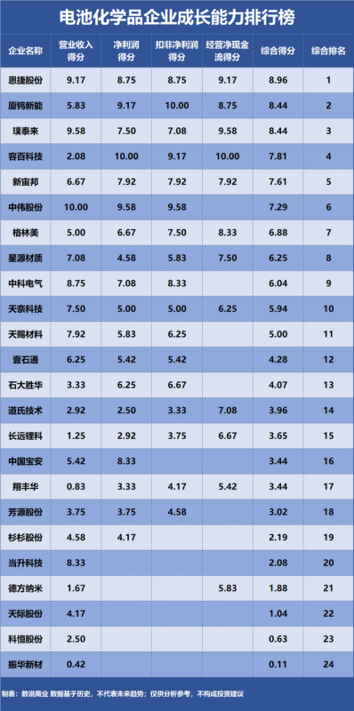 注:成長能力榜單中,各項指標得分按照10/24的比例換算得出,綜合得分為各項指標的平均值。如某個指標有數(shù)值,但沒有得分(即表格為空格),則該指標權(quán)重會下降。