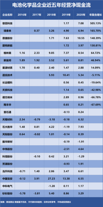 從近五年經(jīng)營凈現(xiàn)金流復(fù)合增長來看,容百科技、璞泰來、恩捷股份、廈鎢新能等4家企業(yè)實現(xiàn)倍數(shù)增長,其中容百科技增長最快,近五年經(jīng)營凈現(xiàn)金流復(fù)合增長達到505.13%。