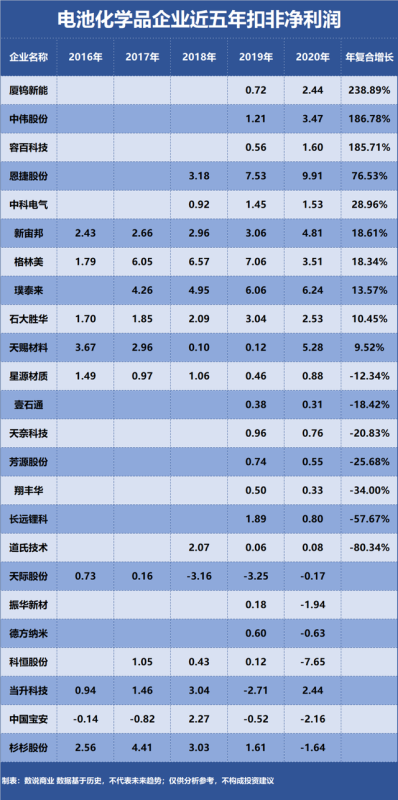 從近五年扣非凈利潤復(fù)合增長來看,廈鎢新能、中偉股份、容百科技等3家企業(yè)實現(xiàn)倍數(shù)增長,其中廈鎢新能增長最快,近五年扣非凈利潤復(fù)合增長達到238.89%。