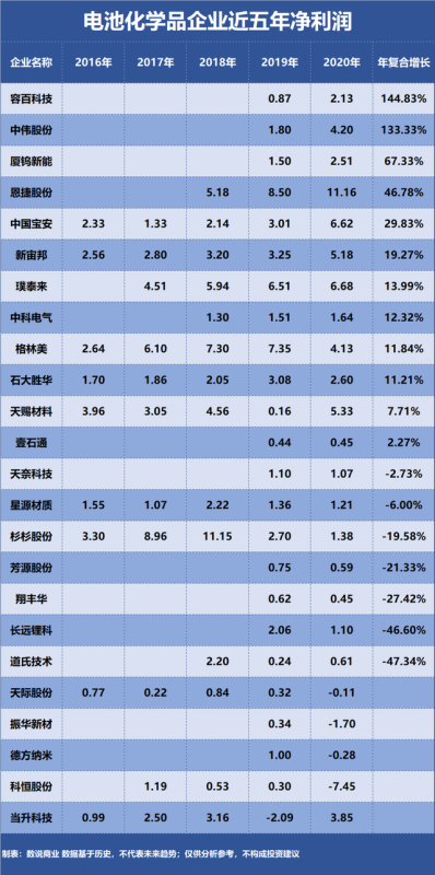 從近五年營收復(fù)合增長來看,中偉股份、璞泰來、恩捷股份等3家企業(yè)增幅超過30%,其中中偉股份增長最快,近五年營收復(fù)合增長達到40.09%。