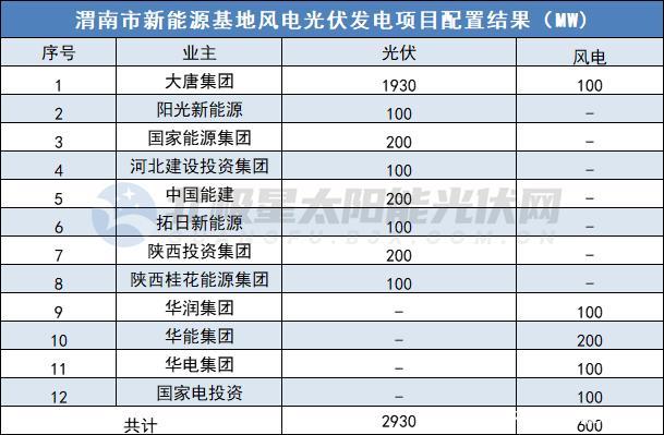 渭南市新能源基地風(fēng)電光伏發(fā)電項(xiàng)目配置結(jié)果公示,確定了排名靠前的13個(gè)項(xiàng)目共計(jì)150萬千瓦納入渭南市新能源基地(其中風(fēng)電4個(gè)共40萬千瓦,光伏8個(gè)共100萬千瓦,風(fēng)光互補(bǔ)1個(gè)共10萬千瓦)。