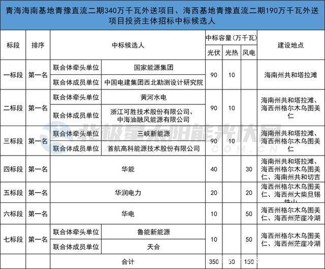 青豫直流二期海南、海西基地外送項(xiàng)目總規(guī)模5.3GW,其中海南基地3.4GW、海西基地1.9GW,共分為7個(gè)標(biāo)段,包括3.5GW光伏項(xiàng)目、1.5GW風(fēng)電項(xiàng)目、0.3GW光熱項(xiàng)目。