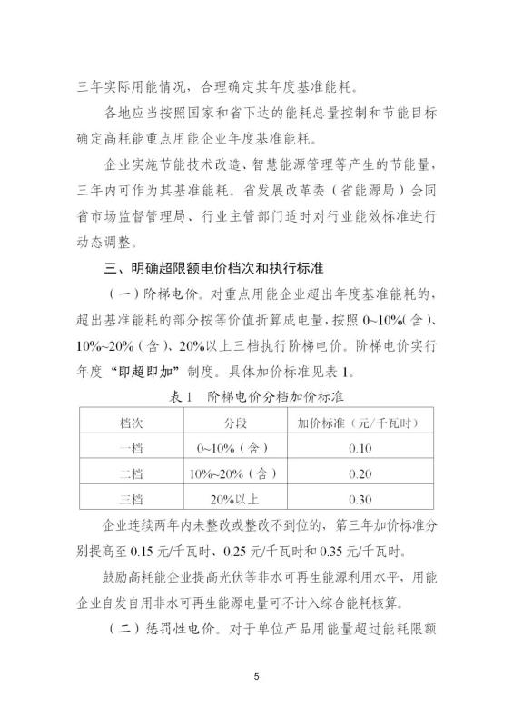 此外,明確了超限額電價檔次和執(zhí)行標(biāo)準(zhǔn):(一)階梯電價。重點用能企業(yè)超出年度基準(zhǔn)能耗的,超出基準(zhǔn)能耗的部分按等價值折算成電量,按照0~10%(含)、10%~20%(含)、20%以上三檔執(zhí)行階梯電價。階梯電價實行年度“即超即加”制度。對于企業(yè)連續(xù)兩年內(nèi)未整改或整改不到位的,加大階梯電價加價幅度。