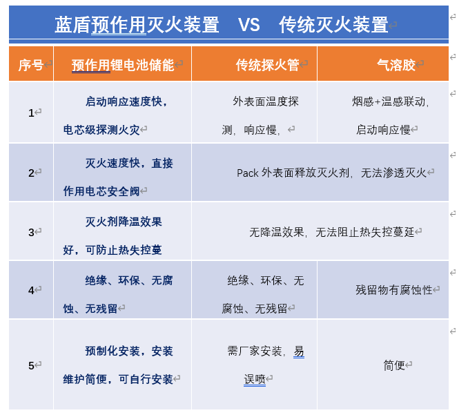 藍(lán)盾科技鋰離子電池儲(chǔ)能消防滅火系統(tǒng)顛覆傳統(tǒng)溫、煙感單一的火災(zāi)探測(cè)方式,可實(shí)現(xiàn)實(shí)時(shí)監(jiān)視、梯次探測(cè),火災(zāi)識(shí)別精準(zhǔn)至PACK,預(yù)警啟動(dòng)至最遠(yuǎn)端釋放鋰電池專用抑制劑時(shí)間<1秒;滅火裝置可點(diǎn)對(duì)點(diǎn)保護(hù)PACK、模組,出現(xiàn)明火后直接將滅火劑輸送至熱失控的電池箱模組內(nèi),撲滅明火時(shí)間≤2秒,同時(shí)還可實(shí)現(xiàn)預(yù)警聯(lián)動(dòng)裝置啟??煽?,持續(xù)多點(diǎn)位、多次防護(hù),該功能配合公司獨(dú)有鋰電池專用抑制劑,可實(shí)現(xiàn)持續(xù)降溫,72h不復(fù)燃,阻止鋰電池?zé)崾Э芈樱籉KF-M系列鋰電池專用抑制劑,率先通過(guò)國(guó)內(nèi)權(quán)威機(jī)構(gòu)檢驗(yàn),具備滅火、快速降溫、持續(xù)抑制、絕緣環(huán)保等特點(diǎn),可防止對(duì)鋰離子電池儲(chǔ)能系統(tǒng)產(chǎn)生次生災(zāi)害。