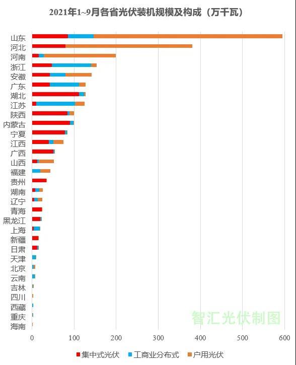 2021年前三季度,各省的新增光伏裝機規(guī)模及構成如下圖所示。
