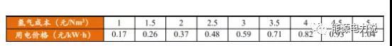 測算據(jù)測算,水電解制氫設(shè)備、安裝、土建及其他總投資 1410 萬元,每年用電等費用為 2700 萬元,每年成本合計 2954 萬元,對應(yīng)氫氣成本 3.69 元/Nm3?,F(xiàn)分別計算不同制氫成本情況下,對應(yīng)的用電價格,如下表所示。