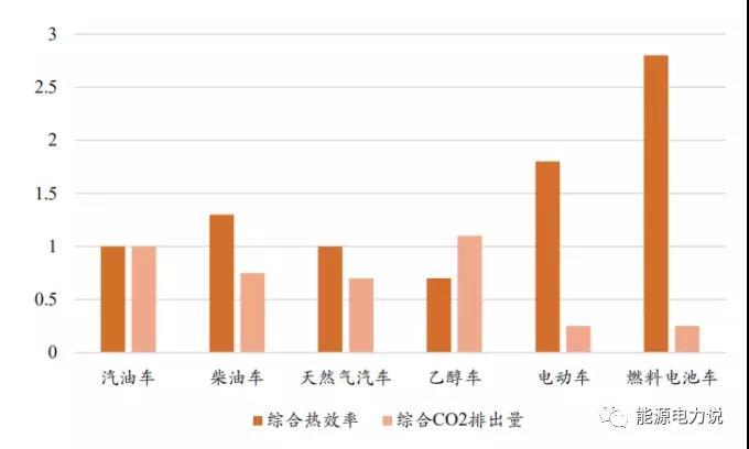 以汽油內(nèi)燃機的綜合熱效率和CO2排放量為基準(zhǔn)來對比。氫燃料電池的綜合熱效率最高,同時 CO2排放量少,是替代石油供給車輛動力的最佳燃料。