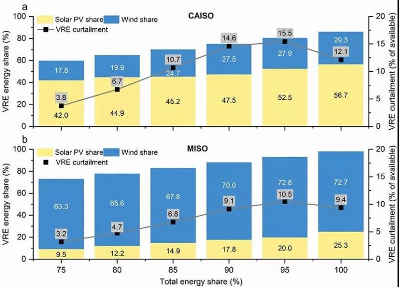 隨著CAISO(上)和MISO(下)系統(tǒng)接近100%可再生能源運行,可再生能源的限電開始減少,因為季節(jié)性儲能變得具有成本效益,并增加了系統(tǒng)的儲能容量。