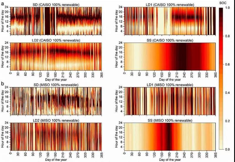CAISO和MISO中短期(SD)、長期(LD1和LD2)和季節(jié)性儲能(SS)的歸一化荷電狀態(tài)(SOC)。(a)CAISO具有100%可再生能源組合的設(shè)備的歸一化SOC。(b) MISO具有100%可再生能源組合的設(shè)備的歸一化SOC。SOC=1(深紅色)表示儲能設(shè)備已滿。SOC=0(淺紅色)表示儲能設(shè)備為空。