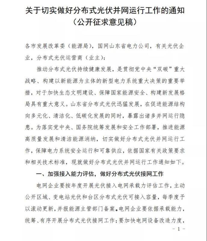 10月22日,國(guó)家能源局山東監(jiān)管辦公室發(fā)布關(guān)于《關(guān)于切實(shí)做好分布式光伏并網(wǎng)運(yùn)行管理的通知》公開征求意見的公告。文件指出,為落實(shí)黨中央、國(guó)務(wù)院統(tǒng)籌發(fā)展和安全工作部署,推進(jìn)能源高質(zhì)量發(fā)展和清潔能源消納,切實(shí)做好分布式光伏并網(wǎng)運(yùn)行工作,保障電力系統(tǒng)安全運(yùn)行和可靠供應(yīng),依據(jù)國(guó)家有關(guān)政策要求和相關(guān)技術(shù)標(biāo)準(zhǔn),現(xiàn)就做好分布式光伏并網(wǎng)運(yùn)行工作通知如下。