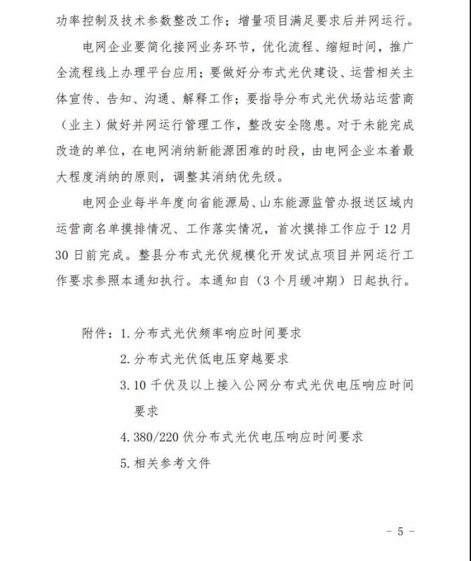 值得注意的是,電網(wǎng)企業(yè)每半年度向省能源局、山東能源監(jiān)管辦報(bào)送區(qū)域內(nèi)運(yùn)營(yíng)商名單摸排情況、工作落實(shí)情況,首次摸排工作應(yīng)于12月30日前完成。整縣分布式光伏規(guī)?;_發(fā)試點(diǎn)項(xiàng)目并網(wǎng)運(yùn)行工作要求參照本通知執(zhí)行。本通知自(3個(gè)月緩沖期)日起執(zhí)行。