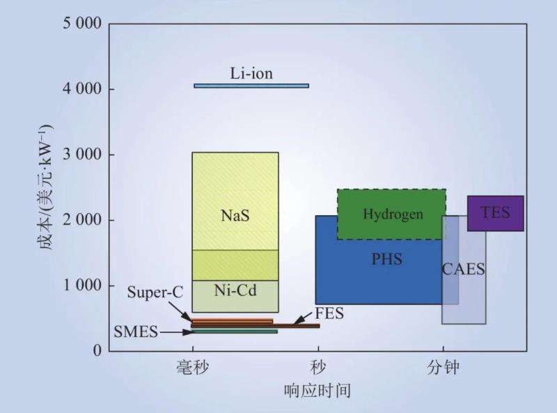 圖3為常見ESS的響應(yīng)時間與投資成本比較。由圖3可知,SMES、FES和Super-C的單位投資成本低于其他儲能技術(shù),鑒于它們的快速響應(yīng)時間,通常用于短期能量儲存[5, 22]。在已開發(fā)的技術(shù)中,SMES的單位投資成本最低,響應(yīng)時間最短[22-24]。電池儲能單位成本相對較高。氫儲能系統(tǒng)投資成本適中,為1500~2400美元/kW[25]。響應(yīng)時間在可接受的分鐘級范圍內(nèi),其系統(tǒng)成本及響應(yīng)時間同樣受氫價值鏈中采用不同技術(shù)路徑的影響。