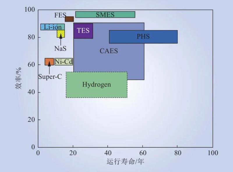 圖2為常見ESS的系統(tǒng)效率和運行壽命比較。ESS循環(huán)效率最高的是SMES,它將電流儲存在由電流流過超導(dǎo)線圈產(chǎn)生的磁場中,由于超導(dǎo)線圈沒有電阻,損耗幾乎為零,僅有附屬電力設(shè)備如交流/直流轉(zhuǎn)換器造成的2%~3%的損耗[22]。FES和Li-ion的系統(tǒng)效率也較高。ESS的能量損耗主要來源于不同組件之間的能量傳遞過程,通過調(diào)節(jié)充電和放電過程中的能量損耗,可以提高ESS的效率。機(jī)械儲能方式中PHS和CAES的使用壽命最長,分別為40~80年和25~60年。電池儲能系統(tǒng)隨著工作時間的延長,電池的化學(xué)性能變差,使用壽命相對較短,大多低于20年。氫儲能系統(tǒng)的循環(huán)效率為35%~55%[20, 23],低于常規(guī)ESS,其主要受氫價值鏈中采用不同技術(shù)路徑的影響,如汽車中氫燃料電池效率約為60%,而通過內(nèi)燃機(jī)的效率約為20%,綜合考慮氫能的價值鏈,氫儲能的壽命為15~50年[24]。