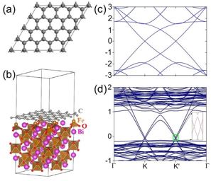 圖 1:(a) 4x4的石墨烯超元胞;(b) 4x4的石墨烯超元胞置于鐵鉍酸的(111)鐵磁面上;(c) 對(duì)應(yīng)于圖(a)的石墨烯能帶圖[狄拉克點(diǎn)無能隙];(d) 對(duì)應(yīng)于圖(b)的能帶圖[狄拉克點(diǎn)打開一個(gè)量子反?;魻栃?yīng)體能隙]。