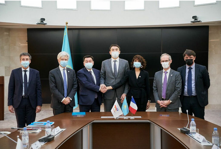 哈薩克斯坦共和國能源部長Magzum Mirzagaliyev(中)和哈薩克斯坦國家石油天然氣公司首席執(zhí)行官Alik Aidarbayev(左三)與能源開發(fā)商Saft、Total Eren和Total Energies公司代表在簽署現(xiàn)場合影。