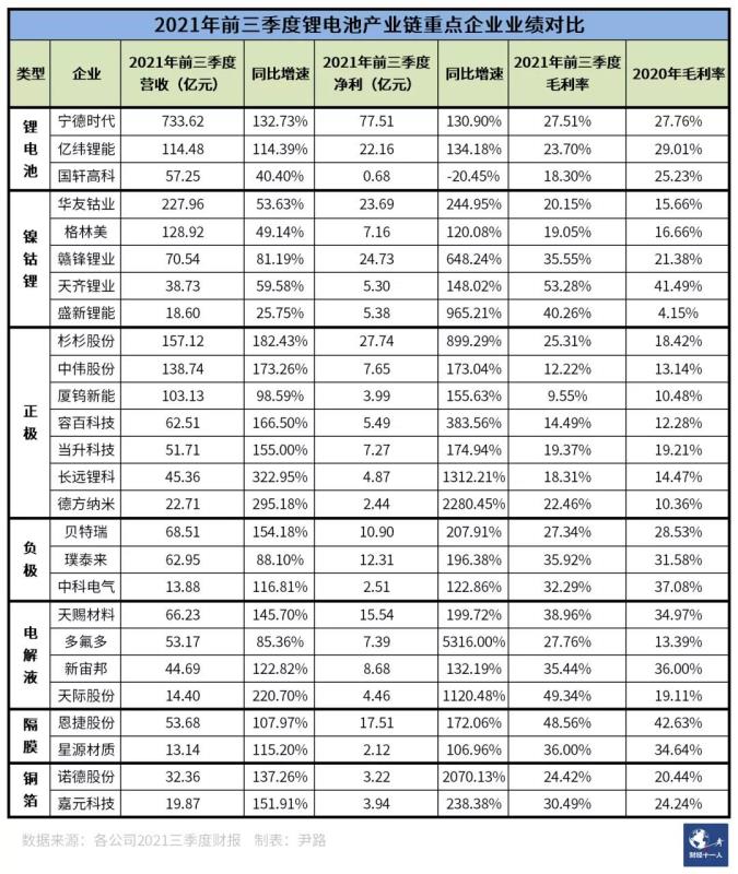 10月底,上市公司紛紛發(fā)布第三季度財(cái)報(bào),《財(cái)經(jīng)十一人》按照電池企業(yè)、鎳鈷鋰礦產(chǎn)企業(yè)、正極、負(fù)極、電解液、隔膜、銅箔的分類梳理了產(chǎn)業(yè)鏈重點(diǎn)企業(yè)的業(yè)績表現(xiàn),見下表。