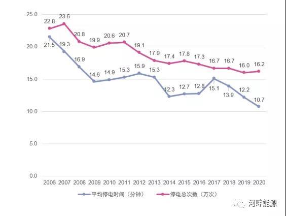 從圖2數(shù)據(jù)可見,德國的年停電總次數(shù)2015年以來持續(xù)降低,2020年較2019年增長2400次(增長1.3%),但仍是有記錄以來的第二低;而2020年電網(wǎng)終端用戶平均停電時間創(chuàng)造2006年以來的最短時間,為10.73分鐘,同比降低了1.47分鐘。