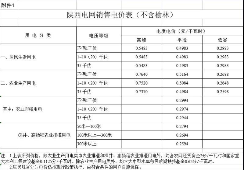 10月22日,陜西省發(fā)改委發(fā)布關(guān)于調(diào)整陜西電網(wǎng)目錄銷(xiāo)售電價(jià)有關(guān)事項(xiàng)的通知。保留居民、農(nóng)業(yè)目錄銷(xiāo)售電價(jià)。取消工商業(yè)目錄銷(xiāo)售電價(jià),有序推動(dòng)工商業(yè)用戶(hù)全部進(jìn)入電力市場(chǎng),按照市場(chǎng)價(jià)格購(gòu)電,取消陜西電網(wǎng)大工業(yè)生產(chǎn)用電、一般工商業(yè)及其它用電目錄銷(xiāo)售電價(jià)。目前尚未進(jìn)入市場(chǎng)的用戶(hù),10千伏及以上的用戶(hù)要全部進(jìn)入,其他用戶(hù)也要盡快進(jìn)入。工商業(yè)及其它用電的輸配電價(jià)和政府性基金及附加由電網(wǎng)企業(yè)按照現(xiàn)行規(guī)定收取(詳見(jiàn)附件2),峰谷分時(shí)電價(jià)按我省規(guī)定的峰谷時(shí)段及浮動(dòng)比例等政策執(zhí)行。