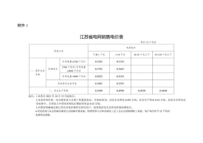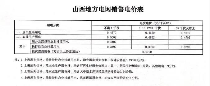 注:1.上表所列價(jià)格,均含國(guó)家重大水利工程建設(shè)基金0.1125分錢(qián)。2.上表所列價(jià)格,除農(nóng)業(yè)生產(chǎn)用電外,均含大中型水庫(kù)移民后期扶持資金0.23分錢(qián)、可再生能源電價(jià)附加0.1分錢(qián)。3.對(duì)執(zhí)行居民生活用電的電壓等級(jí)在35-66千伏及以上的用戶(hù),按表中1-10千伏所對(duì)應(yīng)的電度電價(jià)標(biāo)準(zhǔn)執(zhí)行。4.對(duì)執(zhí)行農(nóng)業(yè)生產(chǎn)用電的電壓等級(jí)在110千伏及以上的用戶(hù),按表中35-66千伏對(duì)應(yīng)的電度電價(jià)執(zhí)行。